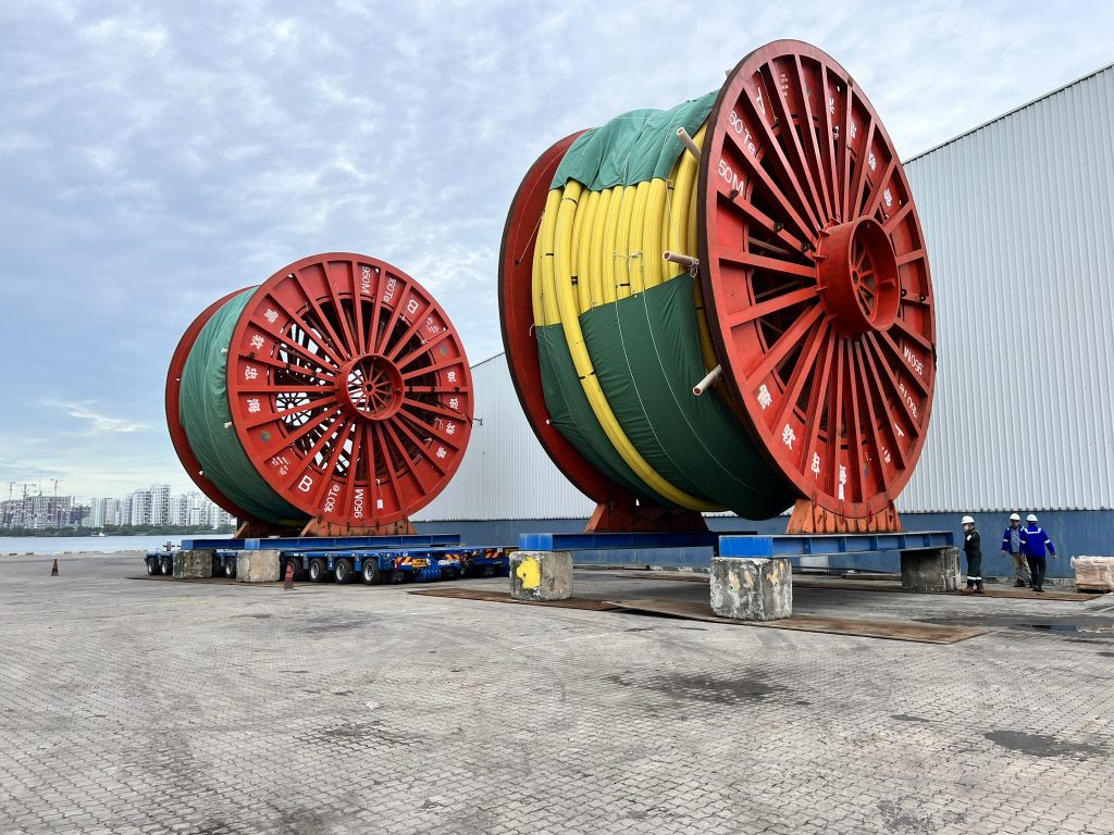 Subsequently, the HLV departed to Johor Port to unload the reels onto a double wide multi-axle trailer. The laden MAT then shifted and jacked down the reels onto concrete stools at the temporary storage yard in Johor port. Following this, the reels were jacked up, shifted from the temporary storage yard to the wharf side, and then lifted and loaded onto a Multi-Purpose Offshore Vessel utilizing the vessel crane.